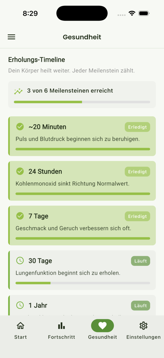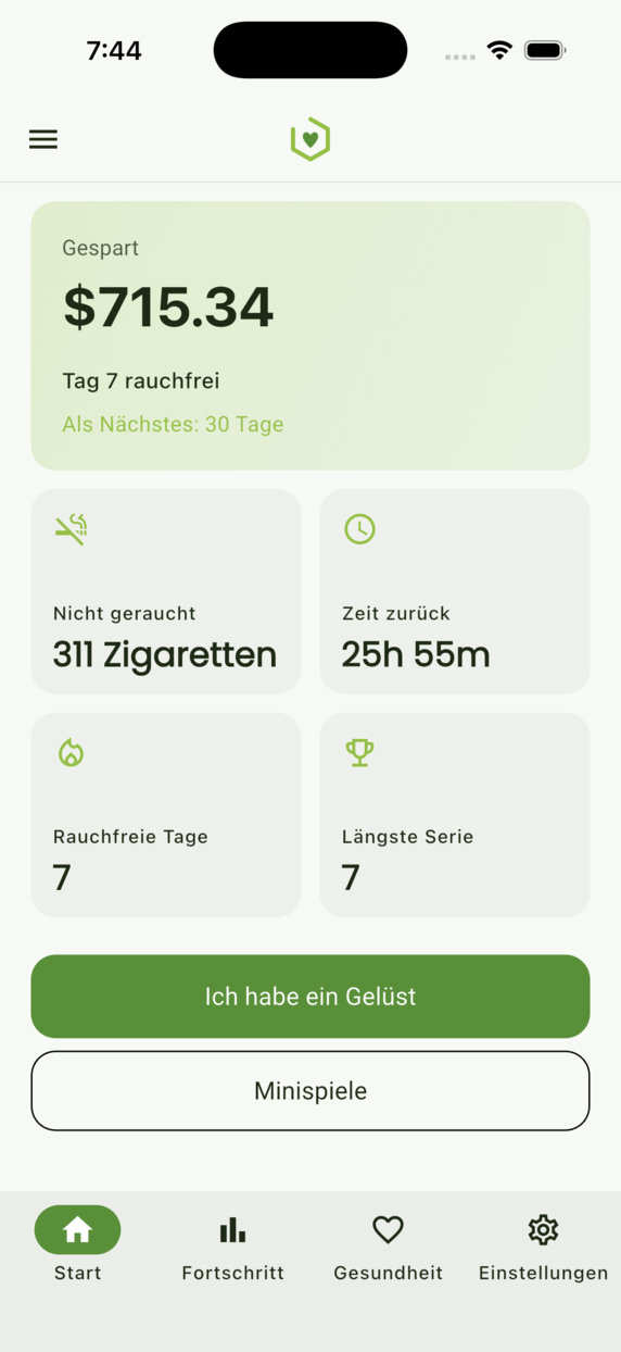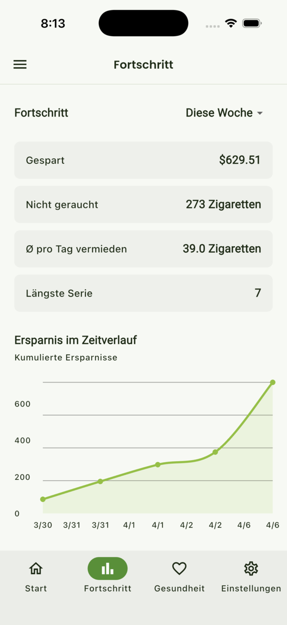 Verfolge deine Serie, übersteh Gelüste, sieh Ersparnisse wachsen und die Erholung deines Körpers — mit Tools und optionalem Premium.